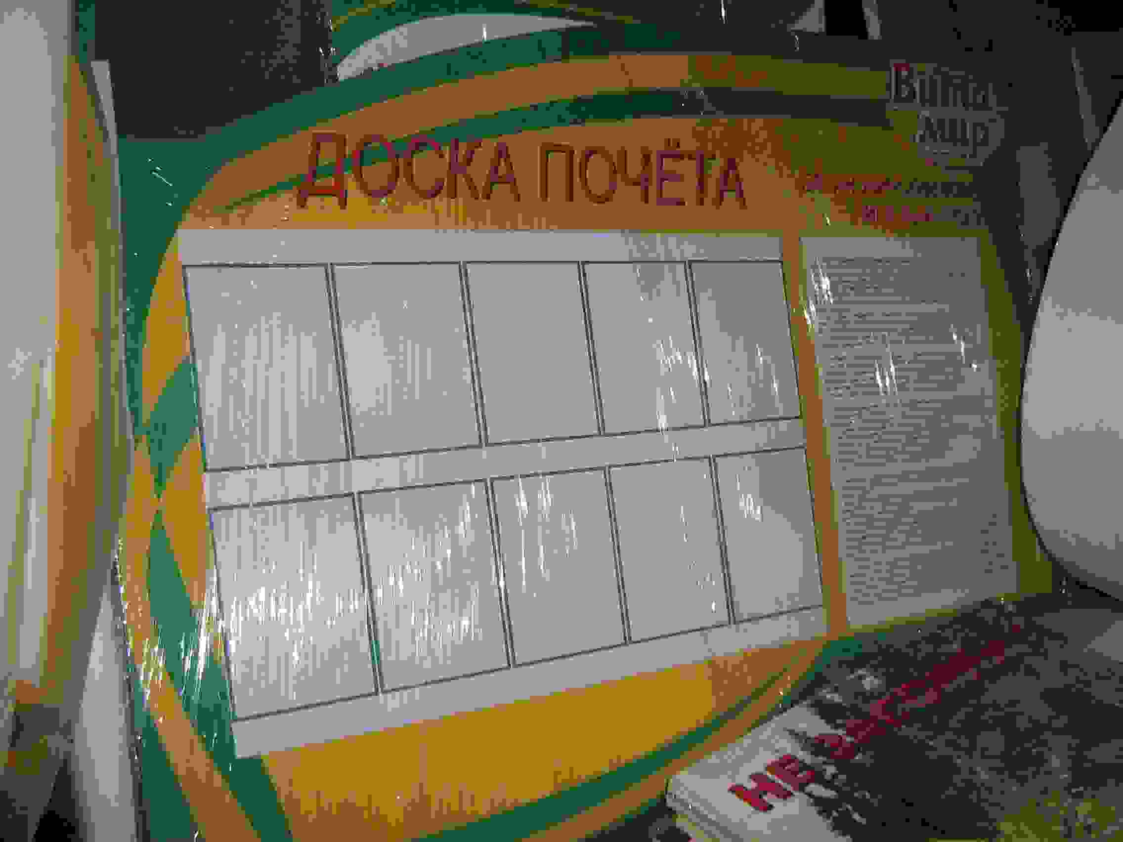 Доска почета – это стенд с фотографиями и именами передовиков производства. Обычно такие конструкции имеют вид широкого щита застеленного либо открытого вида. Могут находиться как в интерьере зданий предприятий и заводов, так и перед ними на улице. Кроме того, могут располагаться на городских улицах.